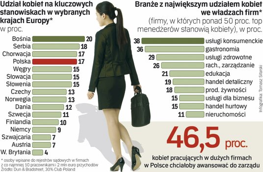 Jednak biorąc pod uwagę całość biznesu, analiza DnB pokazuje wyraźną dominację mężczyzn w zachodnim, w tym w skandynawskim, biznesie. Ta dominacja jest nieco mniejsza w mniej zamożnych krajach postkomunistycznych, w tym w Polsce, do czego przyczynił się też wybuch przedsiębiorczości po transformacji rynkowej. Według analizy KRS, opracowanej na zlecenie Fundacji Sukcesu Pisanego Szminką, prawie 31 proc. polskich firm jest w 100 proc. własnością kobiet, choć w przypadku dużych przedsiębiorstw ten udział nie przekracza 13 proc., co wpływa także na odsetek pań w zarządach.