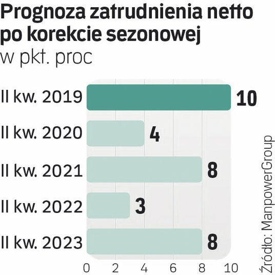 Podczas gdy 28 proc. spośród 510 ankietowanych firm zamierza w II kw. zwiększyć zatrudnienie, to w usługach komunikacyjnych takie plany ma prawie co druga (46 proc.). Jednocześnie sporo, bo co czwarta spółka z tej branży, zapowiada redukcję kadr. Częściej takie deklaracje składają tylko pracodawcy z sektora FMCG , czyli dóbr konsumpcyjnych (27 proc.), w których najsilniej bije inflacyjne zaciskanie pasa przez konsumentów. Łącznie niespełna jedna piąta (19 proc.) ankietowanych firm przymierza się do cięć kadrowych w II kw., co oznacza, że prognoza netto zatrudnienia na kolejne miesiące znów jest dodatnia, a optymiści planujący wzrost zatrudnienia mają 9-punktową przewagę nad pesymistami. Jak wylicza ManpowerGroup, uwzględniając korektę sezonową, prognoza netto zatrudnienia na II kw. tego roku wynosi 8 pkt, czyli jest taka sama jak wiosną 2021 r., o 5 pkt wyższa niż w II kw. 2022 r., gdy nastroje firm zdusił wybuch wojny w Ukrainie i najwyższa od jesieni ub. roku.