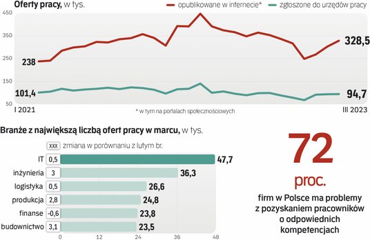 IT, inżynieria, logistyka i produkcja – to te branże opublikowały w marcu najwięcej ogłoszeń o pracy w internecie, zwiększając też ich liczbę w porównaniu z poprzednim miesiącem. Tak wynika z najnowszej analizy Adecco Group i Job Market Insights, którą „Rzeczpospolita” opisuje jako pierwsza. Według ich danych, w ubiegłym miesiącu na portalach rekrutacyjnych i w mediach społecznościowych pojawiło się łącznie 328,5 tys. nowych ofert pracy, czyli prawie o 26 tys. więcej w porównaniu z lutym.