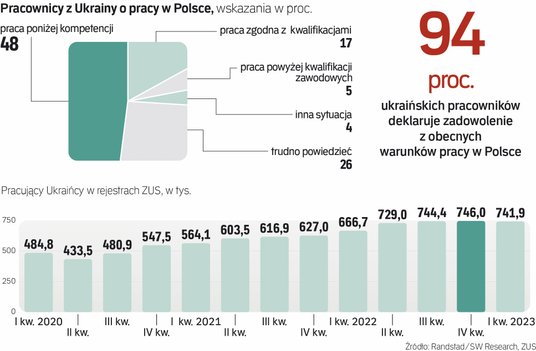 Zarówno dane ZUS, jak i badania prowadzone wśród Ukraińców potwierdzają ich dużą aktywność zawodową – i to pomimo bariery, jaką dla wielu z nich była słaba znajomość języka polskiego. Brak wystarczająco dobrej znajomości polskiego jest zresztą głównym powodem pracy poniżej kwalifikacji zawodowych nie tylko wśród uchodźców wojennych, ale także wśród osób, które przyjechały do pracy w Polsce przed wybuchem wojny. Wskazuje go 60 proc. uczestników ogłoszonego w środę badania agencji zatrudnienia Randstad i SW Research, które jesienią zeszłego roku objęło 609 pracowników z Ukrainy, w tym 85 proc. osób, które mieszkają u nas od wybuchu wojny.