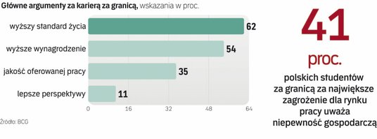 Jak wynika z sondażu BCG, zdecydowana większość, bo trzy czwarte młodych Polaków, planuje karierę za granicą. Czym tłumaczą swój wybór? Przede wszystkim wyższym standardem życia na Zachodzie (62 proc.), a także wyższymi płacami, które kuszą ponad połowę młodych Polaków. Na trzecim miejscu znalazła się jakość pracy oferowanej za granicą, na którą zwracało uwagę 35 proc. badanych.