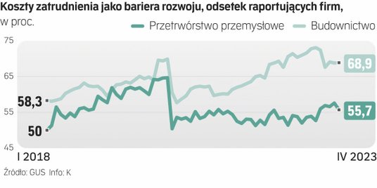 Podobny obraz wyłania się z ankietowych badań NBP wśród firm (tzw. szybki monitoring), których wyniki ukazały się na początku maja. Odsetek przedsiębiorstw informujących o nieobsadzonych miejscach pracy, który malał przez cały 2022 r., w I kwartale br. podskoczył do 43,5 proc. z 41,4 proc. kwartał wcześniej. Wrócił tym samym powyżej swojej wieloletniej średniej. Wzrósł również – choć pozostał na niskim, w ujęciu historycznym, poziomie – odsetek firm, które wskazują braki kadrowe jako barierę rozwoju. Z raportu NBP wynika jednak, że odbicie zatrudnienia to perspektywa kilku kwartałów. Prognozy firm dotyczące zmian zatrudnienia w najbliższych trzech miesiącach w I kwartale br. piąty raz z rzędu uległy pogorszeniu. Poprawiły się natomiast prognozy zatrudnienia w horyzoncie roku.