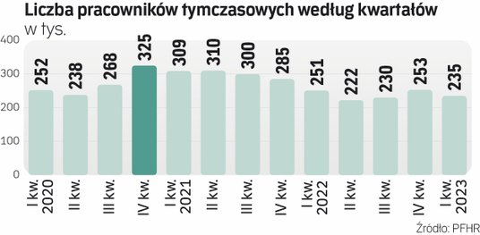 Agnieszka Zielińska, dyrektor PFHR, zwraca uwagę, że bardziej miarodajnych informacji o sytuacji na rynku dostarczają dane o liczbie pracowników tymczasowych. A ta zmalała. Jak szacuje PFHR, w I kwartale br. zatrudniono łącznie 235 tys. pracowników tymczasowych, co oznacza ponad 6-proc. spadek w porównaniu z początkiem 2022 r. Jeszcze bardziej, bo o 8 proc. (do 43 tys.), zmniejszyła się liczba przepracowanych godzin w przeliczeniu na pełne etaty (FTE). Przyczyniło się do tego spowolnienie w przemyśle, który jest głównym klientem agencji pracy tymczasowej.