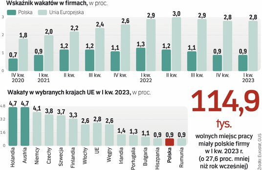 Tymczasem w krajach o niskim bezrobociu wskaźniki wakatów są zwykle wysokie. Tak jest np. w Czechach, które – podobnie jak Polska – mają obecnie najniższe bezrobocie w Unii. Mierzone według metodologii Eurostatu w obu krajach wynosi 2,7 proc. (przy 6 proc. średniej w Unii). Jednak w Czechach wskaźnik wakatów, mimo rekordowego spadku (o 1,5 pkt proc. r./r.), nadal jest wysoki – na koniec marca sięgał 3,8 proc. Z kolei np. w Hiszpanii niski poziom wakatów idzie w parze z wysokim (12,7 proc.) bezrobociem.