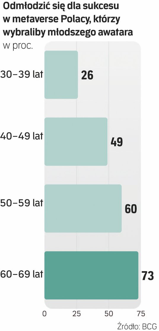 Okazało się, że dużą barierą jest wiek, szczególnie dla osób 50+ (choć nie tylko dla nich). Niezależnie od kraju większość ankietowanych z tej grupy odmłodziłaby swojego awatara, by zwiększyć swoje możliwości kariery. W Polsce zrobiłoby tak 60 proc. badanych w wieku 50–60 lat i prawie trzy czwarte pracowników 60+. Co ciekawe, również w młodszych pokoleniach sporo osób uważa, że lepiej poradziłyby sobie zawodowo z młodszym alter ego. Niemal co drugi Polak w wieku 40–49 lat odmłodziłby się w wirtualnym świecie, a jeszcze częściej zrobiliby to Austriacy (62 proc.), Czesi i Węgrzy (po 58 proc.