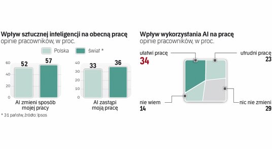 W tym także w życiu zawodowym: 57 proc. uczestników badania Ipsos i 52 proc. Polek i Polaków przewiduje, że rozwój sztucznej inteligencji zmieni sposób wykonywania ich obecnej pracy. Co trzeci z ogółu badanych (w Polsce – 30 proc.) liczy, że ten wpływ będzie pozytywny, bo AI ułatwi im pracę.