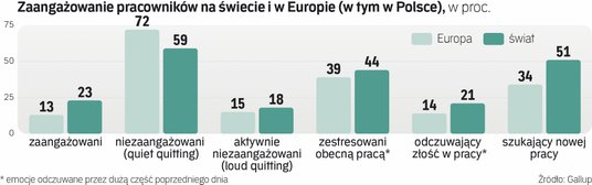 Jednak niezależnie od stanowiska czy regionu największą grupę (na świecie prawie 60 proc., a w Europie 72 proc.) tworzą pracownicy niezaangażowani. To bohaterowie często opisywanego pod koniec 2022 r. zjawiska quiet quitting, czyli cichych odejść, którzy ograniczają się do obowiązkowego minimum w pracy. Część z nich robi to z braku motywacji, a cześć z niechęci do tzw. wyścigu szczurów, który wymusza ciągłe wykazywanie się.