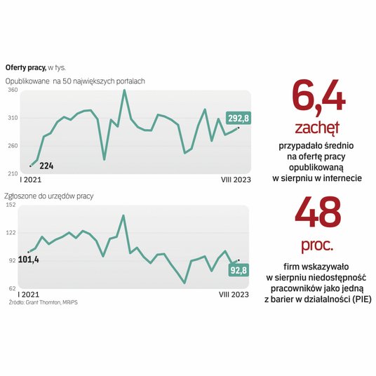 Ten trend potwierdzają też dane raportu Grant Thornton, który zwraca uwagę na 5-proc. rok do roku wzrost liczby ofert dla pracowników fizycznych w sierpniu. Wpłynął na to aż 14-proc. wzrost ogłoszeń skierowanych do kierowców, a także zwiększony wybór propozycji pracy dla kasjerów/sprzedawców. Rosnące zapotrzebowanie na pracowników w handlu detalicznym, logistyce czy marketingu dostrzega też Marta Szymańska, menedżer rekrutacji stałej i ekspert rynku pracy w Manpower, zwracając uwagę, że chociaż w ujęciu rocznym zauważalny jest spadek liczby ofert, to te sektory wykazują względną stabilizację.