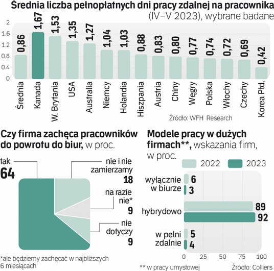 Wiele jednak zależy od kraju i regionu świata. Jak zwracają uwagę eksperci WFH Research (w projekcie uczestniczą m.in. Stanford University, University of Chicago i niemiecki ifo Institute), globalną średnią podwyższają kraje anglosaskie, na czele z Kanadą i Wielką Brytanią. Tam średnia liczba dni pracy z domu zbliża się do dwóch tygodniowo. Nieco gorzej (1,4 dnia) wypadają tu Stany Zjednoczone, gdzie od ponad roku informacje o cięciach zatrudnienia w dużych spółkach technologicznych przeplatają się z komunikatami czołowych korporacji, które już stanowczo wzywają swoich pracowników do powrotu do biur. Przynajmniej na dwa–trzy dni w tygodniu.