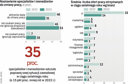 Wprawdzie nowe technologie nadal zapewniają największy wybór ofert zatrudnienia, ale uczestniczący w badaniu specjaliści i menedżerowie IT dostawali w ostatnich miesiącach średnio ponad dwukrotnie mniej zaproszeń od łowców głów niż rok wcześniej. Gorszą koniunkturę widać zresztą we wszystkich specjalizacjach. Najmniej w marketingu, gdzie przeciętna liczba ofert utrzymała się na ubiegłorocznym poziomie (pięć), a najbardziej w administracji, gdzie spadła z 12 do dwóch. W pozostałych obszarach nastąpiły dwu-, trzykrotne spadki.
