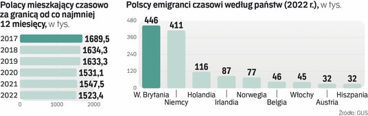 Po tej zmianie, a także po uwzględnieniu danych z prowadzonych za granicą spisów powszechnych, podawana przez GUS liczba Polaków mieszkających czasowo za granicą znacząco się skurczyła. Okazało się, że w 2017 r. przebywało tam na dłużej niespełna 1,7 mln osób (czyli o 850 tys. mniej niż w poprzednich, pełniejszych danych), zaś w 2020 r. liczba ta spadła do 1,53 mln. Najnowsze dane z prognozy GUS oznaczają, że w zeszłym roku za granicą przebywało o 166 tys. Polaków mniej niż pięć lat wcześniej.