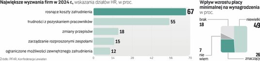 Jak przypominają autorzy badania, duży wpływ na wzrost kosztów zatrudnienia (które już w ubiegłym roku wskazywano jako główną barierę w działalności firm) będzie miała w tym roku dwukrotna podwyżka płacy minimalnej, która łącznie zwiększy się prawie o jedną piątą, dochodząc na początku lipca do 4300 zł. Aż 75 proc. uczestników sondażu PFHR i Konfederacji Lewiatan ocenia, że podwyżka minimalnych stawek będzie miała wpływ na siatkę wynagrodzeń w ich firmie, przy czym 26 proc. przyznaje, że będzie on znaczący.