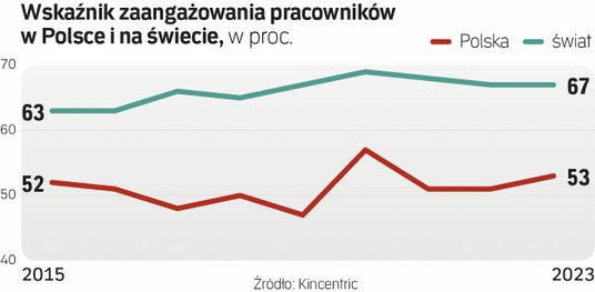 – Ostatnio firmy dużo pracowały nad otwarciem się na młode pokolenie, zaniedbując potrzeby starszych pracowników – komentuje Magdalena Warzybok. Jednak także w przypadku młodych jest sporo do zrobienia. Wprawdzie w grupie poniżej 25 lat (zetek) nastąpiła w 2023 r. największa poprawa zaangażowania – o 5 pkt proc., do 54 proc., lecz polską średnią obniżają milenialsi (25–34 lata). Ich zaangażowanie wzrosło o 2 pkt proc., lecz tylko do 48 proc.
