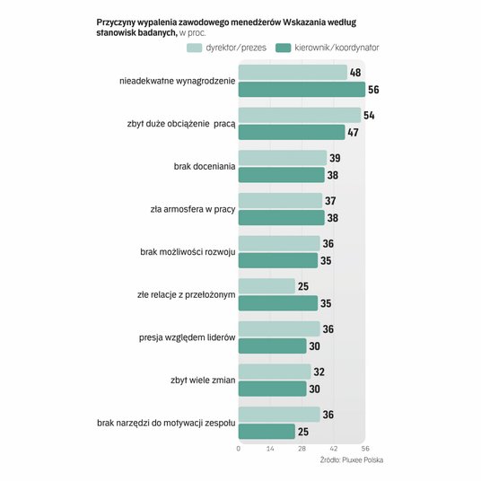 Zbyt duże obciążenie pracą jest na drugim miejscu wśród przyczyn wypalenia zawodowego (tuż za nieadekwatnym, czyli zbyt niskim wynagrodzeniem). Wskazywało je 54 proc. prezesów i dyrektorów oraz 47 proc. kierowników, którzy często narzekają też na złą atmosferę i relacje w pracy (38 proc.). Niepokoić może też fakt, że podczas gdy 61 proc. prezesów i dyrektorów odczuwa wsparcie ze strony firmy, to wśród kierowników i koordynatorów deklaruje je tylko 39 proc. badanych.