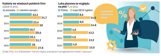 Poprawa tego wskaźnika wpłynęła również na awans Polski w udostępnionym „Rzeczpospolitej” globalnym rankingu firmy PwC „Women in Work Index 2024”, który ocenia sytuację w 33 państwach OECD pod kątem warunków pracy dla kobiet, a także ich aktywności zawodowej – bierze pod uwagę lukę płacową, czyli różnicę w wynagrodzeniu kobiet i mężczyzn, wskaźnik zatrudnienia i stopę bezrobocia w obu grupach i liczbę osób pracujących w pełnym wymiarze godzin i na część etatu.
