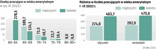 Co 20. pracujący jest w wieku emerytalnym – wynika z danych GUS. Pod koniec września 2023 r. pracowało 475,6 tys. kobiet, które skończyły 60 lat i 292,9 tys. mężczyzn 65-letnich lub starszych. W ciągu dziewięciu miesięcy liczba pracujących kobiet zwiększyła się o prawie 12 tys., a panów – o ponad 18 tys.
