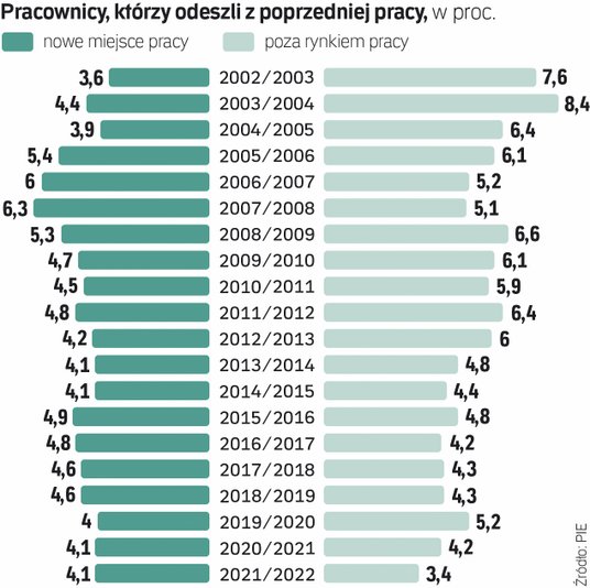 W ostatnich 20 latach rocznie średnio co dziesiąty pracownik rozstawał się z dotychczasowym pracodawcą (nie zawsze dobrowolnie). Ten wskaźnik podwyższały osoby zatrudnione na umowach na czas określony, które niekiedy pracują sezonowo. W tej grupie wskaźnik rotacji jest dwukrotnie wyższy i w ostatnich latach oscylował wokół 20 proc. Dlatego też, chcąc zwiększyć lojalność pracowników, firmy chętniej oferowały umowy o pracę.