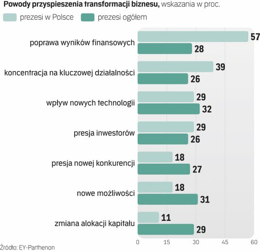 Jak zwraca uwagę Jacek Kędzior, prezesi w Polsce nie godzą się z takim stanem rzeczy – szansę na szybszy rozwój widzą w zmianach, w tym w transformacji biznesowej swoich przedsiębiorstw. Aż 80 proc. szefów w Polsce i 58 proc. na świecie (łącznie zbadano plany 1200 top menedżerów w 21 krajach) zapowiada w tym roku przyspieszoną transformację biznesu.