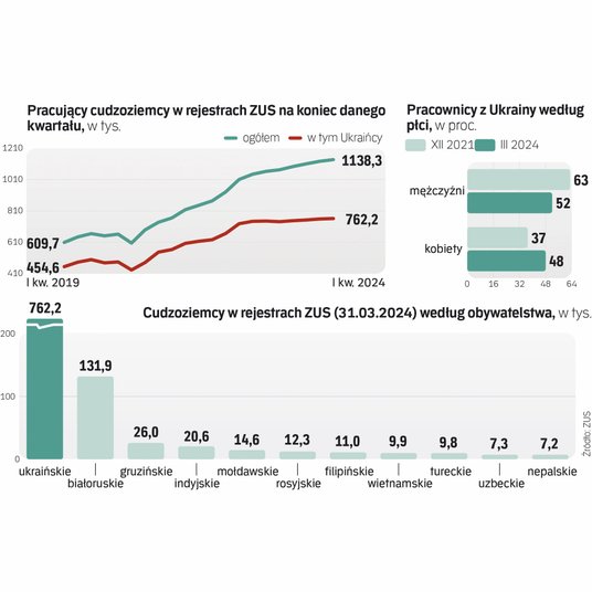 Na koniec I kwartału 2024 r. już ponad 1 mln 138 tys. pracowników z zagranicy było objętych składkami na ZUS. To prawie o 65 tys. więcej niż rok wcześniej. Wakaty, szczególnie w mniej atrakcyjnych dla Polaków branżach, coraz częściej wypełniają cudzoziemcy. Nadal są to w większości Ukraińcy, których liczba w rejestrach ZUS doszła pod koniec marca do 762,2 tys., o ponad 20 tys. więcej niż rok wcześniej.