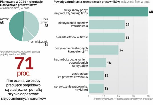 Badanie Hays Poland jest kolejnym, które dowodzi, że wśród pracodawców w Polsce rośnie popularność zewnętrznych pracowników; według niedawnego sondażu firmy Tikrow 60 proc. firm zamierza w najbliższych tygodniach wspierać się dorywczym zatrudnieniem „na dniówki”. Podczas gdy dorywcze zatrudnienie (popularne m.in. w produkcji, logistyce czy gastronomii) dotyczy głównie pracowników fizycznych, to praca projektowa i na kontraktach B2B jest przede wszystkim ofertą dla specjalistów.