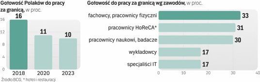 Sporo jednak zależy od branży i zawodu; najczęściej o emigracji zarobkowej myślą osoby wykonujące prace fizyczne, w tym co trzeci z rzemieślników i fachowców, którzy na Zachodzie mogą liczyć na najwyższe, bo co najmniej trzykrotne przebicie krajowych zarobków. Względy finansowe i ekonomiczne są zresztą najczęściej wskazywanym powodem gotowości do pracy za granicą, przy czym Polacy podkreślają je nawet częściej (79 proc.) niż ogół potencjalnych emigrantów na świecie (64 proc.).