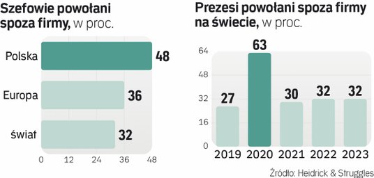 Przyczyniły się do tego zmiany w 2020 r., gdy aż 63 proc. badanych prezesów na świecie pochodziło spoza firmy. Jednak w ostatnich dwóch latach (gdy wiele spółek dotknęło spowolnienie w gospodarce) udział top menedżerów z zewnątrz zmalał na świecie do 32 proc. Może to oznaczać, że w trudniejszych czasach, gdy firmy starają się ograniczać ryzyko, wolą też przekazać stery sprawdzonej już osobie znającej ich biznes.