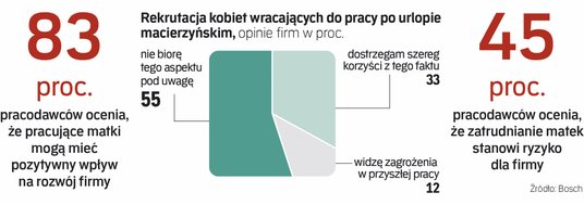 Tylko co ósmy (12 proc.) z przedstawicieli pracodawców dostrzega związane z tym zagrożenia. Jak jednak zaznacza Anna Łabno-Kucharska z fundacji Mamo Pracuj, która wspiera aktywność i aktywizację zawodową matek, 33-proc. udział firm otwartych na kobiety wracające do pracy po urlopie macierzyńskim potwierdza, że potrzebne są działania edukacyjne.