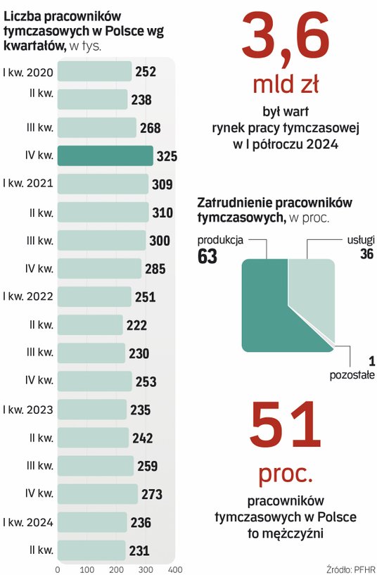 Jak wynika z raportu Polskiego Forum HR (PFHR), który „Rzeczpospolita” opisuje pierwsza, II kwartał nie przyniósł odbicia pracy tymczasowej po nie najlepszym początku tego roku. Widoczny w danych PFHR ok. 5-proc. wzrost obrotów firm członkowskich, jak i całego rynku pracy tymczasowej (który w II kw. wyceniano na ok. 1,8 mld zł, a w całym I półroczu na ok. 3,6 mld zł), był przede wszystkim efektem wzrostu płac. W tym ustawowej podwyżki płacy minimalnej, która jest teraz o ponad jedną piątą wyższa niż rok wcześniej. I jest podstawą wynagradzania pracowników tymczasowych w wielu branżach, w tym w przetwórstwie spożywczym i w logistyce.