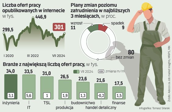 Ten trend widać również w udostępnionej „Rzeczpospolitej” analizie Adecco Group, która obok portali pracy obejmuje także media społecznościowe. Według niej w lipcu w polskim internecie pojawiło się niemal 301 tys. nowych ogłoszeń rekrutacyjnych, o ponad 8 proc. więcej niż miesiąc wcześniej i o ponad 4 proc. więcej niż w lipcu zeszłego roku.