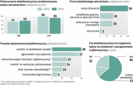 Już prawie połowa pracujących Polaków dorabia, wykonując jakąś formę dodatkowej pracy. W ciągu roku ich odsetek zwiększył się z 41 do 45 proc. Jeszcze więcej, bo prawie sześciu na dziesięciu, pracowników zamierza dorabiać w najbliższych sześciu miesiącach – wynika z badania firmy SW Research dla agencji zatrudnienia Gi Group, które „Rzeczpospolita” opisuje jako pierwsza.