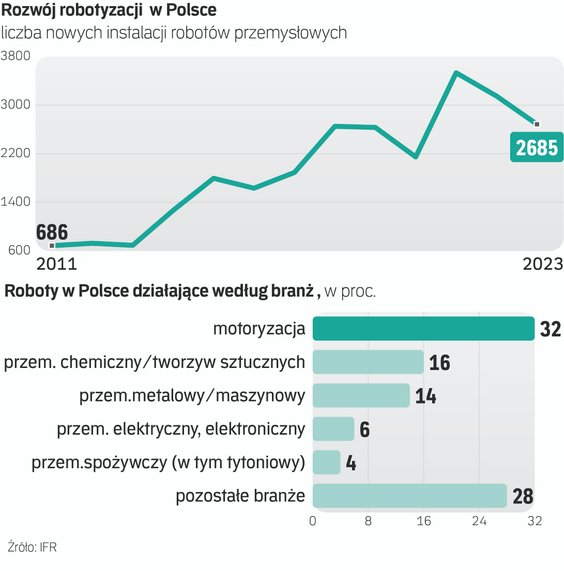 Jak zaznaczają eksperci IFR, ubiegłoroczny wynik nadal oznaczał – wolniejszy wprawdzie – ale wzrost liczby działających w Polsce robotów przemysłowych, których na koniec 2023 r. było 24,8 tys., czyli o 9 proc. więcej niż rok wcześniej. Jednak spowolnienie ich przyrostu oznacza rosnący dystans wobec liderów robotyzacji, w której Polska zajmuje 18. miejsce na świecie. Globalną czołówkę tworzyły na koniec zeszłego roku Chiny (z 1,8 mln działających robotów), Japonia, Korea Południowa, USA i europejski lider – Niemcy. To m.in. dzięki inwestycjom w Niemczech, a także w Indiach (gdzie liczba instalacji wzrosła o 59 proc.) ubiegły rok był trzecim z kolei, gdy globalna liczba nowych instalacji robotów przekroczyła pół miliona – sięgnęła 541 tysięcy, czyli o 2 proc. mniej niż rok wcześniej.
