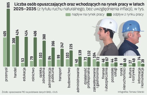 Ubytek około 2,1 mln pracowników do 2035 r. szczególnie mocno dotknie m.in. edukację i ochronę zdrowia, gdzie ubędzie kolejno 29 i 23 proc. „rąk do pracy” względem obecnego stanu. Niemniej tak naprawdę w każdym segmencie gospodarki napływ nowych pracowników nie będzie rekompensował odpływu. Ekonomiści z PIE szacują, że sam ubytek pracowników w przemyśle do 2035 r. o prognozowane przez nich 11 proc. zmniejszyłby (przy założeniu utrzymania innych czynników bez zmian) PKB Polski o 6–8 proc.