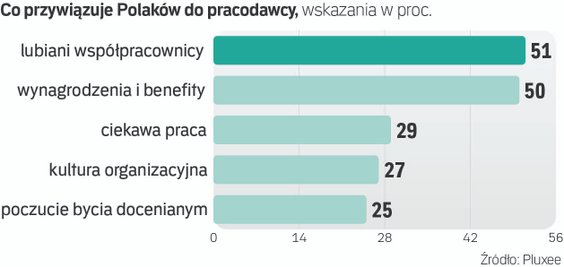 Wspomniany przez szefa Pluxee trend jest widoczny m.in. w odpowiedziach na pytanie o czynniki, które przywiązują pracowników do firmy. Na drugim miejscu znalazły się (wskazane przez połowę badanych) wynagrodzenia i benefity, które jednak o włos, bo o 1 pkt proc., przegrały z ludźmi. To oni, a konkretnie współpracownicy, z którymi Polacy lubią pracować, powstrzymują ich najczęściej przed szukaniem nowej pracy.