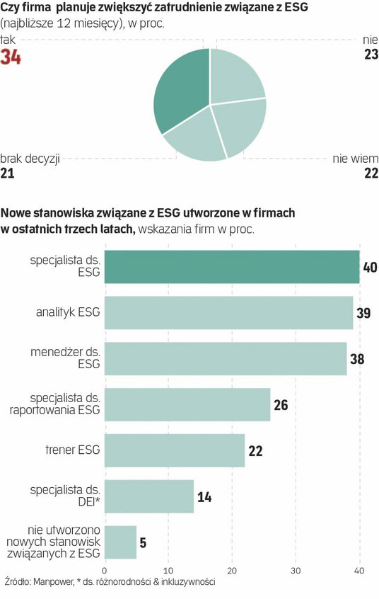 Według badania ManpowerGroup, które objęło 750 specjalistów i menedżerów z różnej wielkości firm, 34 proc. z nich przewiduje, że w ciągu najbliższych 12 miesięcy ich firma zwiększy zatrudnienie w obszarze ESG. Tylko niespełna co czwarty z przedstawicieli pracodawców stanowczo twierdził, że nie ma takich planów. Pozostali nie podjęli jeszcze decyzji w tej sprawie albo nie znali planów firmy.