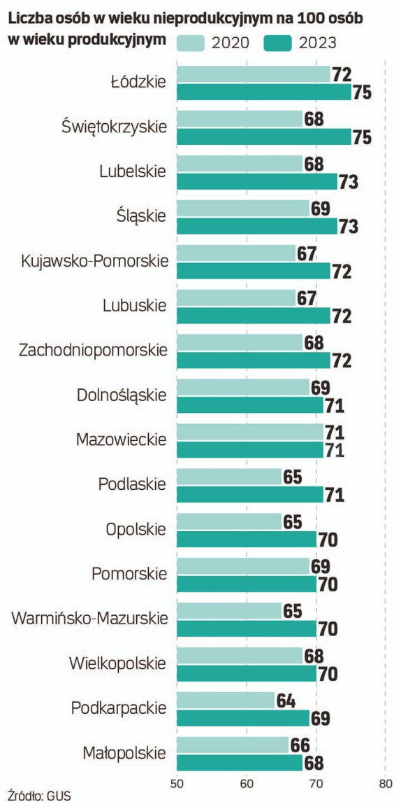Z danych GUS wynika, że Mazowsze to jedyne województwo, w którym nie zmieniła się relacja pomiędzy tymi, którzy mogą pracować, a tymi którzy jeszcze lub już tego nie robią. Na 100 osób w wieku produkcyjnym pod koniec zeszłego roku przypadało 71 dzieci, młodzieży i starszych. Pod koniec 2020 r. była to najpoważniejsza regionalna różnica, a po trzech latach – średnia w kraju. Najwięcej niepracujących przypadało na pracujących (po 75 osób) w woj. łódzkim i świętokrzyskim, a najmniej w Małopolsce (68) i na Podkarpaciu (69) pod koniec 2023 r.