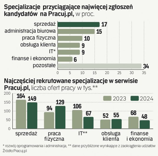 Sprzedaż, administracja biurowa i praca fizyczna – te trzy kategorie cieszyły się w 2024 roku największym zainteresowaniem wśród osób szukających pracy na Pracuj.pl. Przypadało na nie ponad dwie piąte aplikacji, które w zeszłym roku napłynęły na ogłoszenia zamieszczone w serwisie – wynika z udostępnionego „Rzeczpospolitej” raportu. Podczas gdy w Pracuj.pl opublikowano wówczas 773 tys. ofert pracy, a więc o ponad 8 proc. mniej niż rok wcześniej (844 tys.), to mocno się nasiliła konkurencja wśród kandydatów.