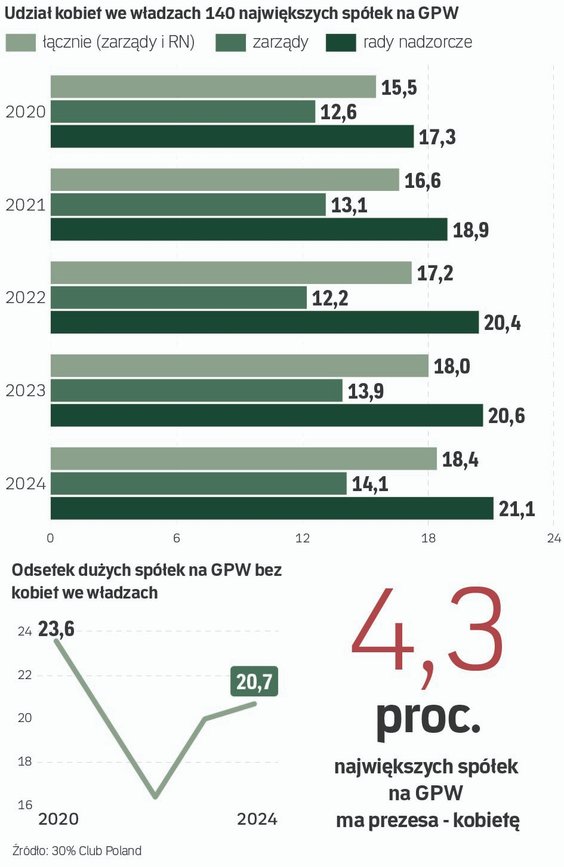 Najpierw jednak duże SSP muszą przygotować do spełnienia wymagań określonych w ustawie wdrażającej do polskiego prawa unijną dyrektywę Women on Boards. Zgodnie z projektem tej ustawy, do końca czerwca 2026 r. duże spółki giełdowe będą musiały zapewnić łącznie co najmniej 33-proc. udział niedoreprezentowanej płci w zarządach i radach nadzorczych zaś największe spółki z udziałem Skarbu Państwa powinny to zrobić do końca grudnia tego roku. Tak by od stycznia 2026 r. kobiety stanowiły 33 proc. ich władz.