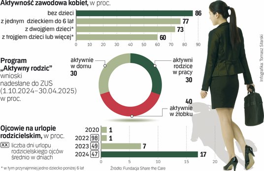 Przeznaczają na nie średnio 4,2 godz. dziennie, czyli prawie dwukrotnie więcej niż mężczyźni. Tę nierówność widać też w statystykach ZUS; to na kobiety przypada aż 79 proc. dni absencji z tytułu opieki nad chorym dzieckiem.