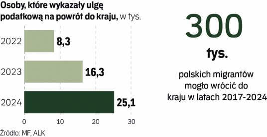 Według danych MF, popularność tej ulgi rośnie - w ubiegłym roku skorzystało z niej 25,1 tys. osób, ponad trzykrotnie więcej niż w pierwszym roku jej obowiązywania (2022). To jednak niewiele jak na szacowaną przez ekspertów skalę powrotów.