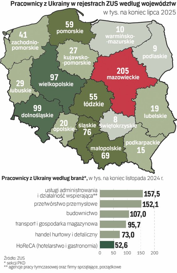 Jak wynika z najnowszych danych ZUS, na koniec czerwca Ukraińcy stanowili 5 proc. pracowników w rejestrach ZUS i dwie trzecie legalnie pracujących cudzoziemców. Dzisiaj ten udział może być jeszcze większy, bo w lipcu liczba pracowników z Ukrainy objętych ubezpieczeniem ZUS wzrosła niemal o 7 tys. zbliżając się do 825 tysięcy.
