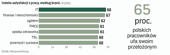 Już prawie dwie trzecie (65 proc.) polskich pracowników deklaruje w badaniu ManpowerGroup, że ufa swoim przełożonym. W ciągu dwóch lat odsetek tych deklaracji zwiększył się o 7 pkt. proc. (z 58 proc. w 2024 r.). Przełożyło się to na wzrost wskaźnika satysfakcji w pracy. Obecnie sięga on 62 proc., wobec 60 proc. przed dwoma laty, choć widać spore różnice w zależności od branży, wieku i stanowiska. Badanie potwierdza, że najwięcej satysfakcji praca przynosi dyrektorom i członkom zarządów (66 proc.), a dorównują im w tym kluczowi pracownicy pierwszej linii. Z kolei najmniej zadowoleni są pracownicy fizyczni (58 proc.).