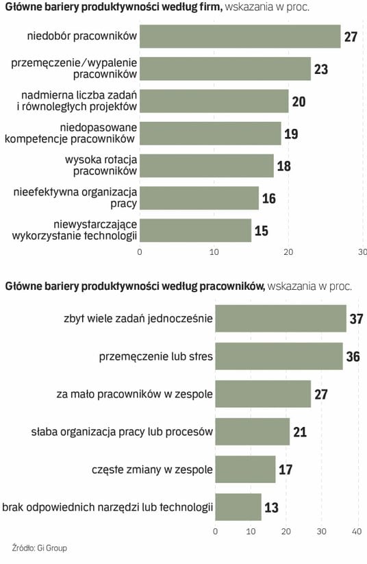Powodem zbyt dużej liczby zadań (którą również firmy wskazują jako barierę produktywności) i związanego z tym przemęczenia jest z kolei zbyt mała liczba pracowników w zespole. Zajęła ona trzecie miejsce na liście barier utrudniających efektywną pracę, gdyż pod presją ograniczania kosztów sporo firm rezygnuje z wypełnienia wakatów po odchodzących pracownikach, rozdzielając ich obowiązki wśród pozostałych członków zespołu.
