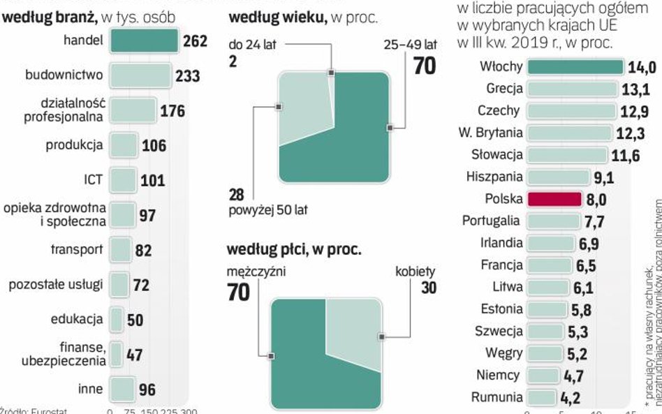 Co więcej, samozatrudnionych przybywa szybciej niż osób na etatach, więc stanowią oni już 8 proc. wszystkich pracujących Polaków. Jeszcze kilka lat temu było to 7 proc.