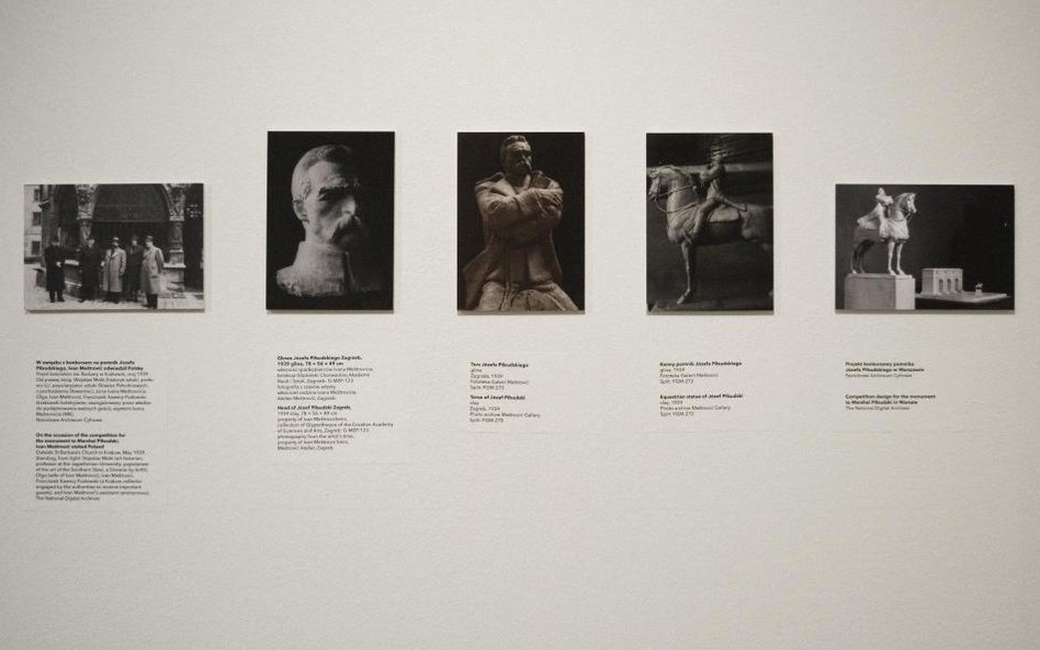 A przecież Ivan Meštrović (1883-1962) był znany i ceniony w Polsce już w okresie międzywojennym, o czym najlepiej świadczy fakt, że został zaproszony w maju 1939 roku do międzynarodowego konkursu na pomnik Józefa Piłsudskiego, razem z takimi sławami jak Francuz Maillol i Norweg Vigeland. Opracował wtedy kilka projektów pomnika Marszałka, który miał stanąć w Warszawie. Planował monumentalną rzeźbę bohatera na koniu. W jednym z wariantów wkomponowana została w łuk triumfalny, który miał mieścić muzeum Piłsudskiego. Wybuch drugiej wojny uniemożliwił realizację. Na obecnej wystawie możemy zobaczyć fotografie, przedstawiające modele pomnika w różnych fazach, pochodzące z Zagrzebia i Splitu.