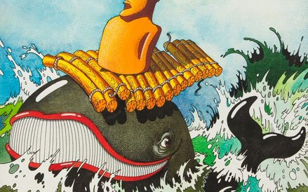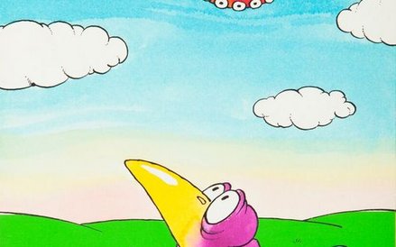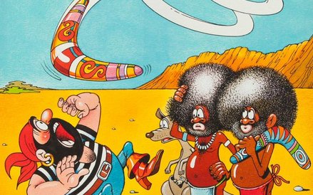 Na prezentowanym rysunku, odwiedzając Australię, niefortunnie rzucił bumerangiem, wywołując konsternację tubylców i towarzyszącego im kangura.