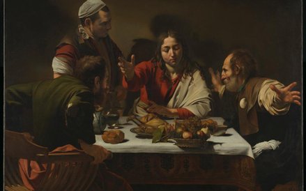 „Wieczerza w Emaus" opowiada o spotkaniu Chrystusa z dwoma uczniami po Zmartwychwstaniu. Caravaggio namalował scenę w gospodzie z właściwym sobie realizmem, ale i żarliwością wiary. Chrystus ma krągłą młodzieńczą twarz, a zarazem w geście błogosławieństwa emanuje duchowym skupieniem. Uczniowie jakby zastygli, gdy rozpoznali Pana. Martwa natura z koszem przejrzałych owoców na pierwszym planie przypomina, że Caravaggio był mistrzem i prekursorem tego gatunku. Oba obrazy powstały w Rzymie latach 1601–1602 na zamówienie kolekcjonera Ciriaca Mattei.