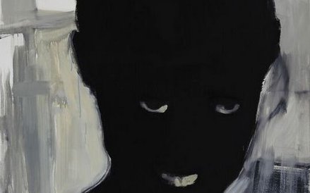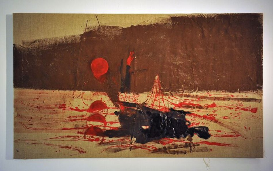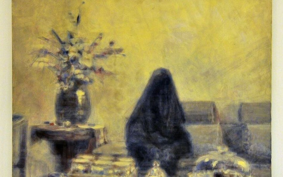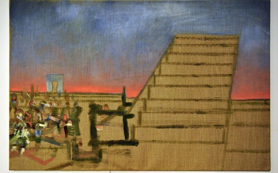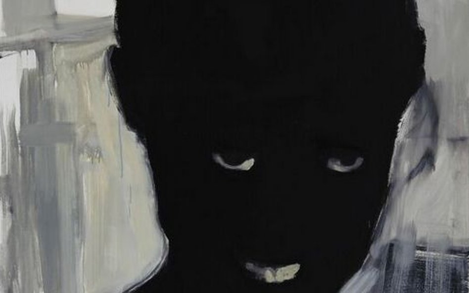 Nieco dalej wyspa ekspresyjnej abstrakcji. Surowe płótno przecięte rdzawym masywem; pod nim czarna gruda lawy, całość poznaczona plamami i kleksami czerwieni. Treść łatwo dopowiedzieć. Oto mur, pod którym padł człowiek, zakatowany przez niewidocznych oprawców. Tytuł potwierdza domysły: „Kuwejt". Ta praca zestawiła mi się (w głowie) z inną: „Zawstydzony imigrant". Wizerunek anonima. Czarnoskórego i – zgodnie z tytułem – spoglądającego ku nam błagalnym, przepraszającym wzrokiem. Twarz bez rysów, lecz wyraz nadaje jej samo spojrzenie. Mocne jak plakat.