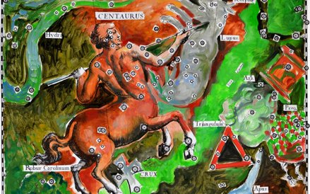 Fangor wybrał z „Atlasu..." 28 ilustracji (dwie z nich pojawiają się w dwóch różnych wersjach) – i zaszalał. Heweliuszowe figury potraktował jako konstrukcję, czy raczej szkice, dla własnych malatur. Nie trzymał się sztywno konturów sylwet, wykraczał poza nie, jedne zamalowywał, inne traktował impresyjnie, pokrywając plamkami, ciapkami, cieniowaniem. Dorabiał tła, zamieniał niebo w ziemię, bawił się skojarzeniami i symboliką barw.