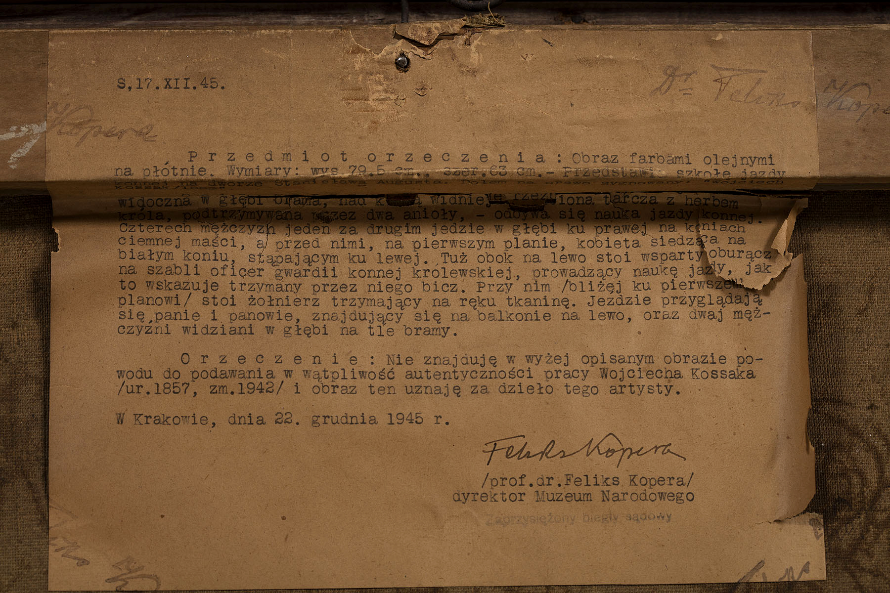 Wojciecha Kossaka - syna Juliusza, a ojca Jerzego - uznaje się za czołowego reprezentanta polskiego malarstwa historycznego, dotychczas kojarzonego jednak z bitewnym tumultem, potyczkami ułanów czy oddziałami z Racławickiej Panoramy. Powstała w 1883 r. „Szkoła jazdy Stanisława Augusta Poniatowskiego” pochodzi natomiast z wczesnego okresu głośnych, międzynarodowych sukcesów malarza, przenosząc odbiorców w scenerię nie tyle wojskową, co wytwornie dworską.