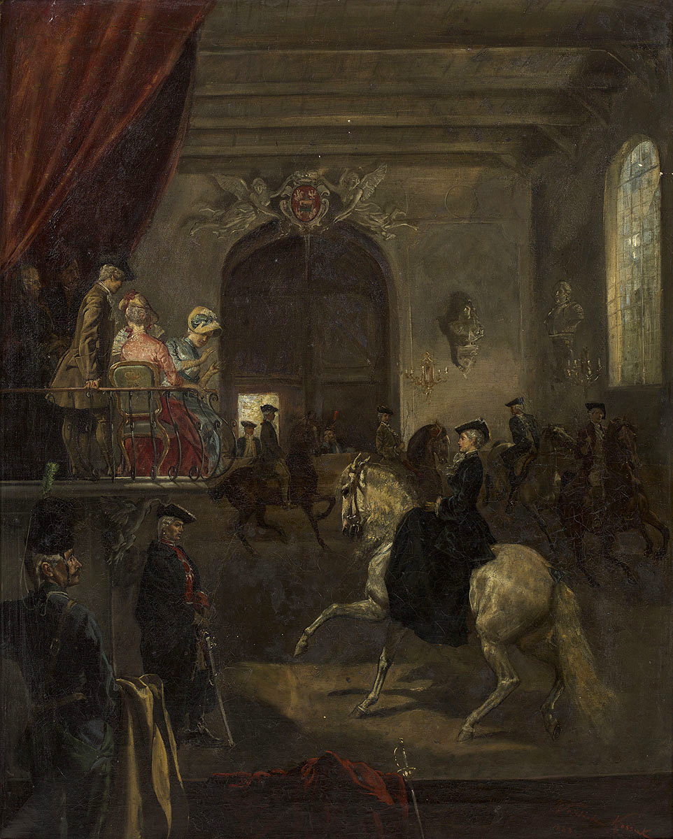Na kilka miesięcy, a może i tygodni przed jej powstaniem, wystawiane w Wiedniu dzieło Kossaka nabyło cesarskie muzeum w Peszcie, następne w kolejce było muzeum praskie, a jedną z batalistycznych scen kupił do swojego zamku cesarz Austrii. Istniał w tym czasie również zdobiony kolumnadami, reprezentacyjny budynek królewskiej ujeżdżalni, w którym rozgrywa się niespotykanie pogodna akcja obrazu - widziana zza przegrody nauka jazdy, której z kutego balkonu przyglądają się eleganccy dworzanie, damy z wachlarzami, a poniżej wsparty na szabli oficer królewskiej gwardii.